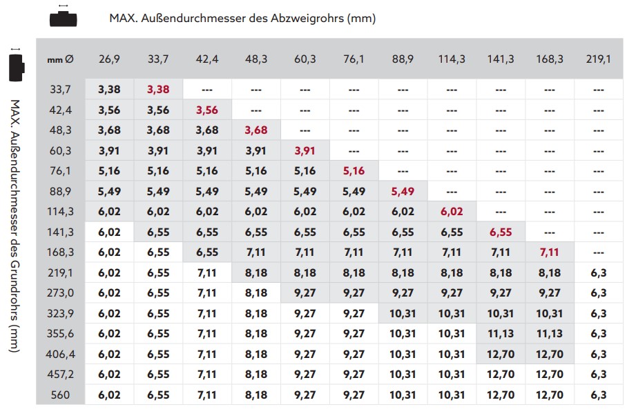 Durchmesser Verzweigungsrohr 19 – 219,1 mm